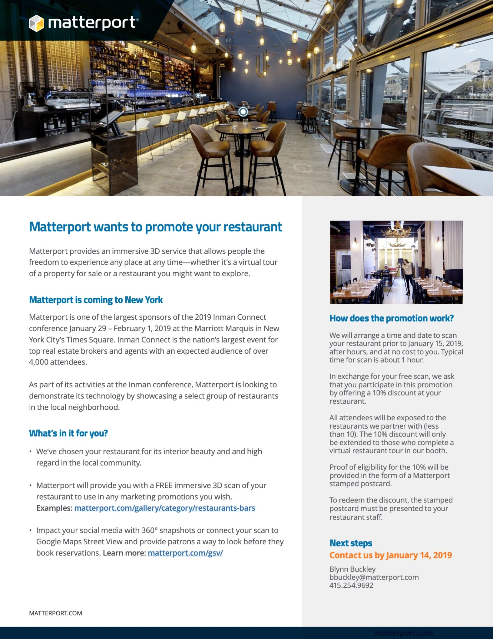 The Restaurant Week campaign was a key component of a larger multi-channel strategy. We negotiated partnerships with top Times Square restaurants to capture 3D digital twins of their venues, then positioned these immersive experiences both at the conference and online, allowing attendees to explore restaurants before visiting, and non-attendees to experience them remotely. Combined with mobile billboard activations across Times Square and geo-targeted campaigns, the work demonstrated Matterport's technology in real-world, high-stakes environments that resonated with enterprise buyers.